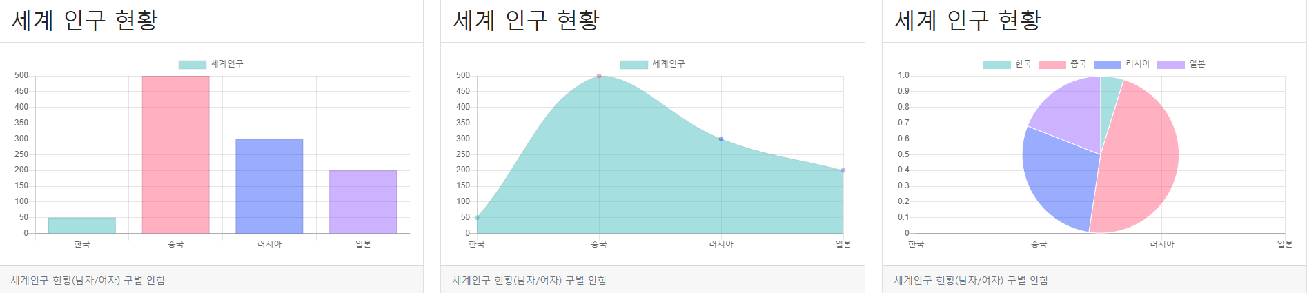 짜잔~~ 대단하죠?? 저희가 만든 겁니다. 별로 손대지도 않았는데 정말 이쁘게 나왔습니다. 근데 차트는 하나만 하지는 않죠? 저희가 정적인 데이터를 따로 뺀 이유는 중복이 돼서 뺸것도있지만 재활용성을 위한 겁니다. 정적인 거는 어는 상황에서든 똑같은 역할만 하니 계속 코드의 흐름을 따라올 필요는 없기 때문입니다.
