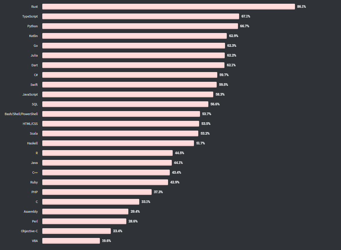 가장 사랑받는 언어에서 2위를 차지하고 전 세계에서 가장 높은 연봉과 관련된 언어에서도 꽤 높은 순위를 차지합니다.