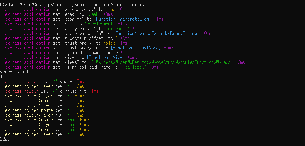 그렇게되면 안에 있는 routes는 실행이 안되는게 정상인거죠 보통 node 초보 분들이랑 다른 코드를 참고하실 때 routes를 function 안에 담은거를 거의 보신적이 없을겁니다. routes를 global 영역에 넣어서 하기 때문에 주소 진입시 node에 작성한 글로버 영역에 있는 routes 코드가 실행이되는걸로 착각하시는 분들이 많습니다. 하지만 그거는 완벽히 틀린 방식입니다. 일단 저희가 서버를 뭐로 생성하고 routes를 뭐로 이용해서 코드를 짰죠? 바로 express는 입니다. 이쯤 되면 express를 까보면 알겠지라고 해서 console.log(app); 이런식으로 확인해보시면 알겠지만 별다를 정보가 없습니다. 저희가 궁금한 답을 제대로 알기위해서는 cmd 창에 "set DEBUG=express:* & node index.js" 라는 거를 입력하시고 엔터를 치신 후 node index.js를 실행시켜보세요.