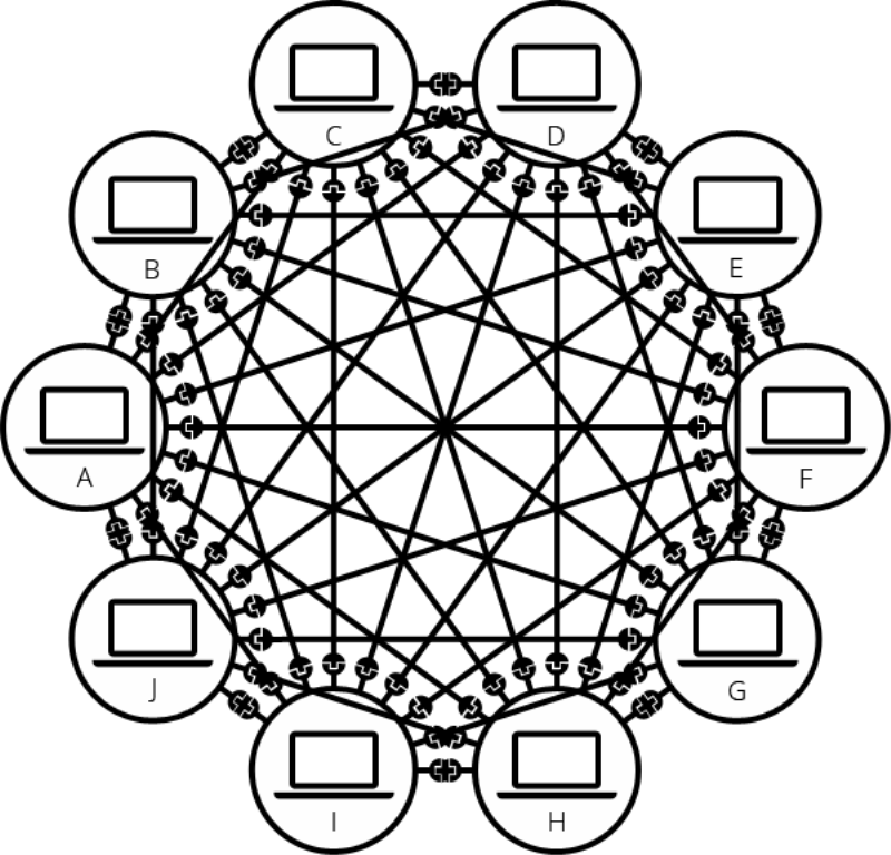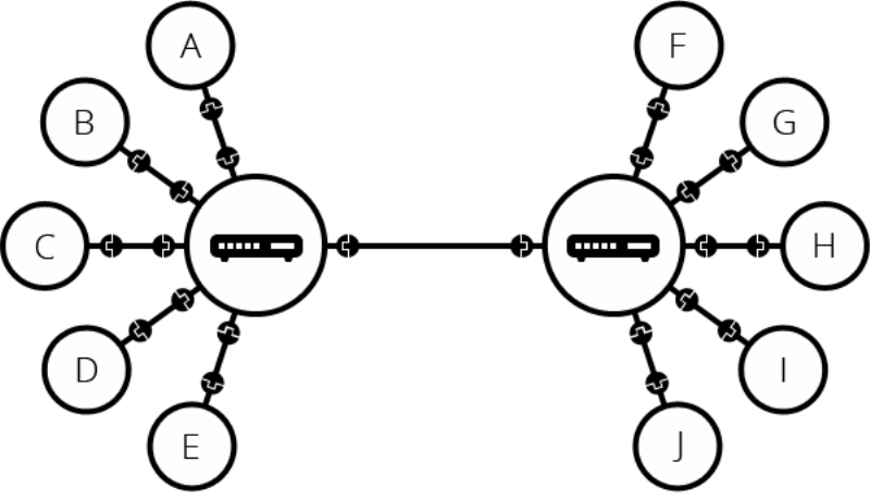 그래서 이문제를 해결하기 위해 라우터라는게 나왔습니다. 자 라우터 덕분에 훨씬 깔금해졌네요. 각 컴퓨터는 라우터라는 특수한 소형컴퓨터에 연결이 됩니다. 지금 위 사진처럼 컴퓨터와 컴퓨터간의 연결이 아닌 컴퓨터가 하나의 10개의 플러그가 있는 라우터에 10대의 컴퓨터 각 하나씩 가지고있는 케이블로만 연결이 됩니다. 하지만 이 라우터는 생각보다 간단한 작업을 합니다. 그냥 데이터를 원하는 컴퓨터한테 데이터를 잘 전달해주게 하는겁니다. 컴퓨터 A가 컴퓨터 B에게 메시지를 보내려면 일단 메시지를 라우터로 보내야하며 라우터는 이 메시지를 B로 전달하고 그 외에 상관없는 컴퓨터에게는 보내지 않도록 하는겁니다. 쉽죠? 하지만 이방법도 몇백 몇천대의 컴퓨터는 단일 라우터로 확장이 불가능합니다. 근데 처음에 저희가 컴퓨터와 컴퓨터는 연결할 수 있었잖아요? 라우터도 컴퓨터이기 때문에 라우터끼리 연결해서 네트워크를 확장할 수 있습니다.