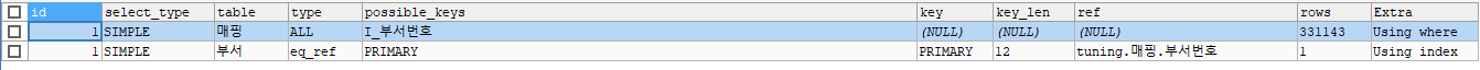 부서 테이블의 총 rows는 9개 부서사원_매핑 테이블 총 개수는 30만개 입니다.