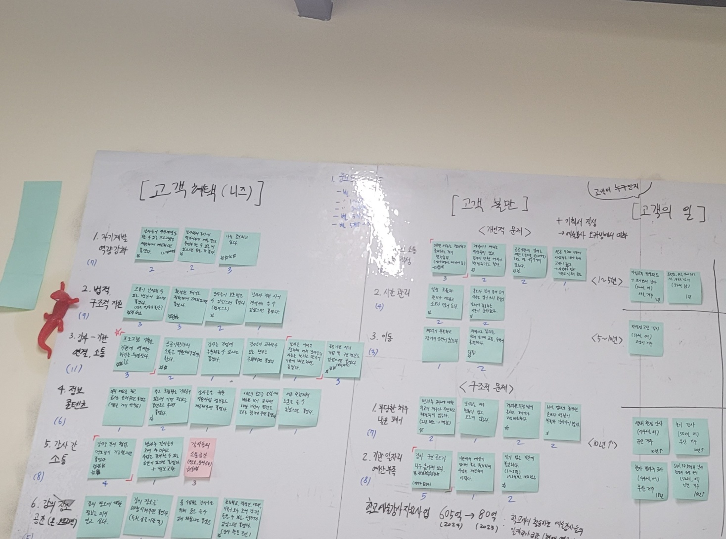 이러한 대답을 하기 위해서 COO님은 40명정되는 강사 분들한테 일일이 전화 및 오프라인 인터뷰를 통해 데이터를 얻었고 얻은 미팅 내용은 간략화하여 포스트잇으로 칠판에 붙여 강사님들이 생각하시는 문제를 다같이 보고 회의를 진행하였고 공통된 문제와 나중에 해결할 문제를 나눠 프로젝트를 진행하게되었습니다.
